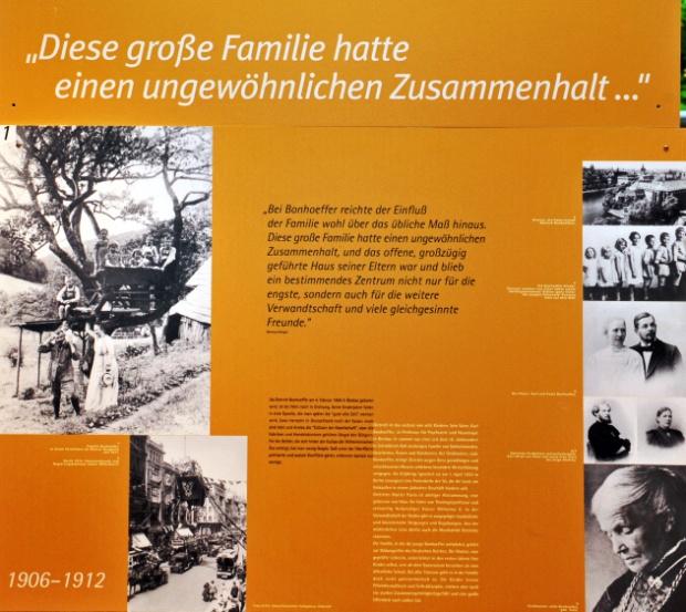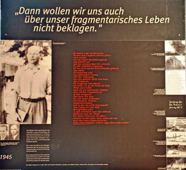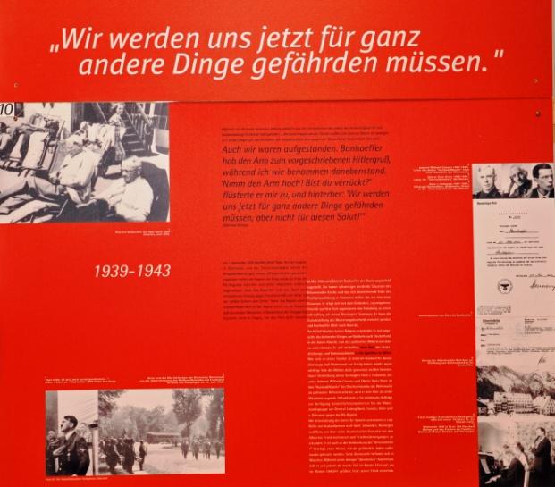 Die 13 Tafeln beginnen mit den Familiendaten, es folgt Bonhoeffers theologisches Werden. Die Auseinandersetzung mit dem Nazi-Regime schließt sich an: „Nur wer für die Juden schreit, darf auch gregorianisch singen.“ Die Gefängniszeit schließt sich in den letzten Tafeln an – bis zu seiner Ermordung im KZ Flossenbürg.